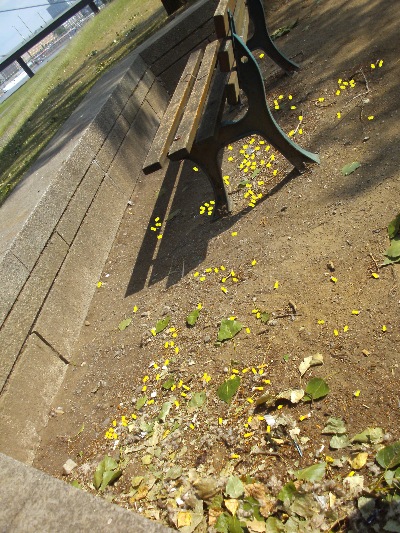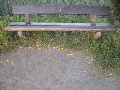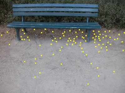 (Anm.: Auf dem oberen Foto sind die in der Fotodatei sichtbaren Kippen im Bereich der 1. Sitzbank markiert, auf dem unteren Foto diejenigen der rechten Bank)