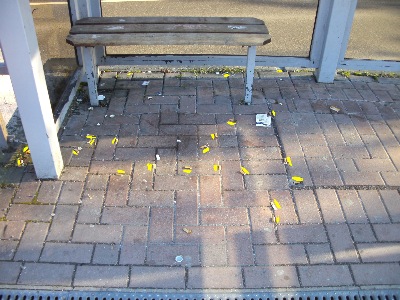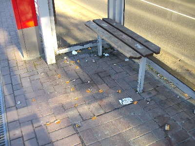 die Konsumation, Emmissionen und Hinterlassenschaften konzentrieren sich jedoch in den Bereichen des Wartehäuschens, der an und für sich dafür angelegt ist, um den Reisenden Schutz vor Witterungseinflüssen zu bieten.