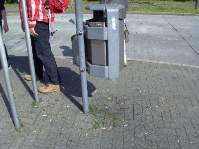 In der guten Absicht, zur Reinhaltung des Bereiches beizutragen bietet manches Verkehrsunternehmen / Kommune Entsorgungsvorrichtungen an, welche mitten im Wartebereich installiert, ein unangenehmes Ambiente mit sich bringen können. Trotz vorgehaltenen "Aschen"-bechers landet ebenselbe auf dem Boden und werden viele Kippen auf den Boden geworfen, bringt der Aschenbecher Geruchsbelästigung mit sich und fordert förmlich zum "Rauchen" auf.